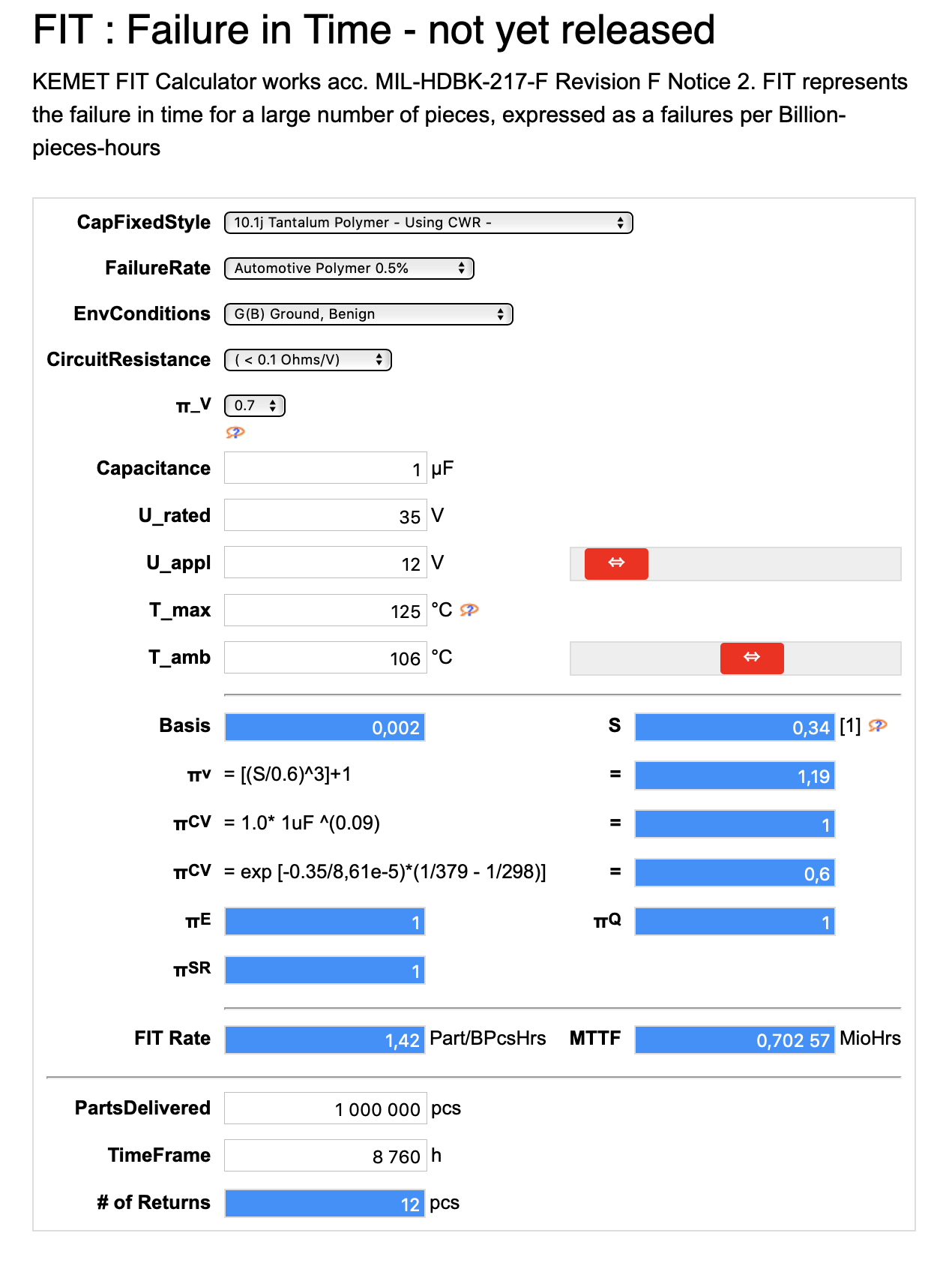 KEMET FIT Calculator works acc. MIL-HDBK-217-F Revision F Notice 2. FIT represents the failure in time for a large number of pieces, expressed as a failures per Billion-pieces-hours